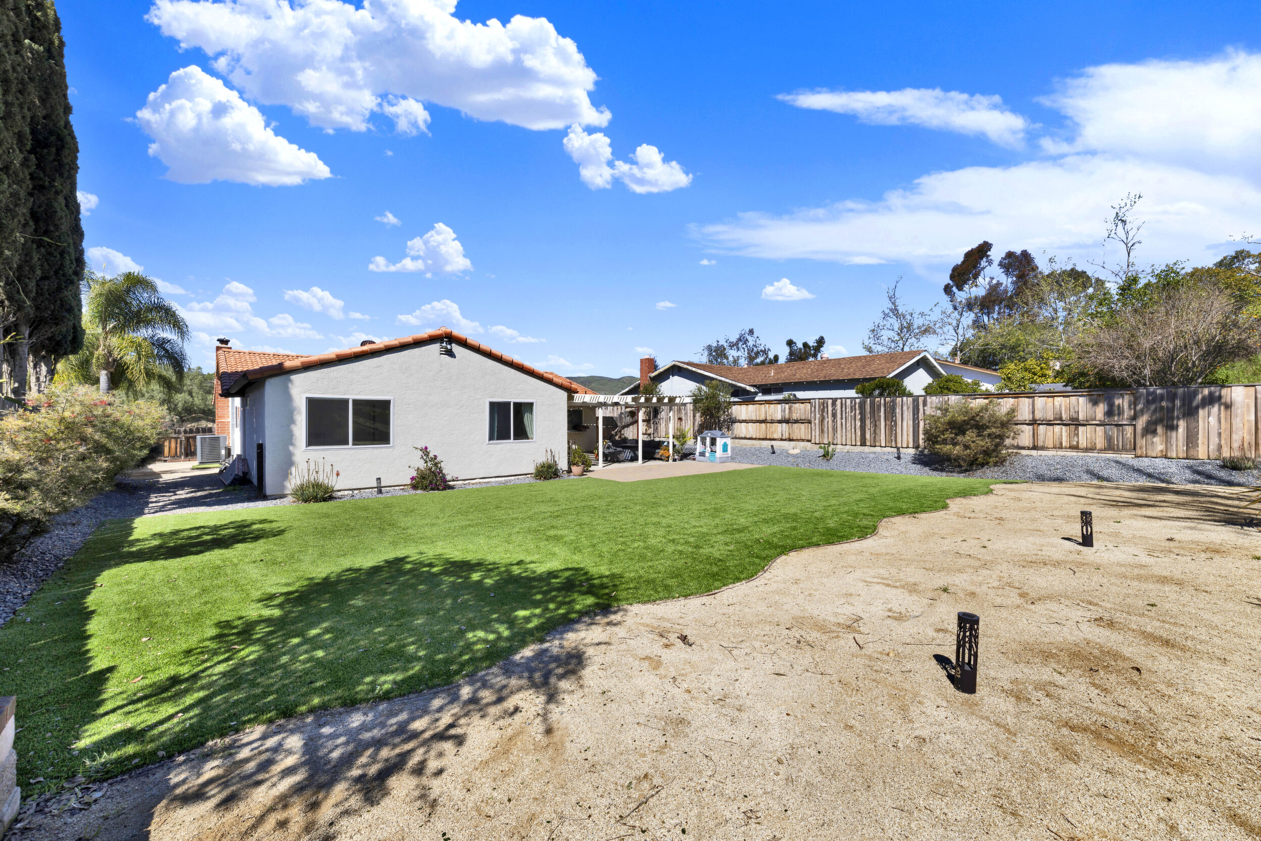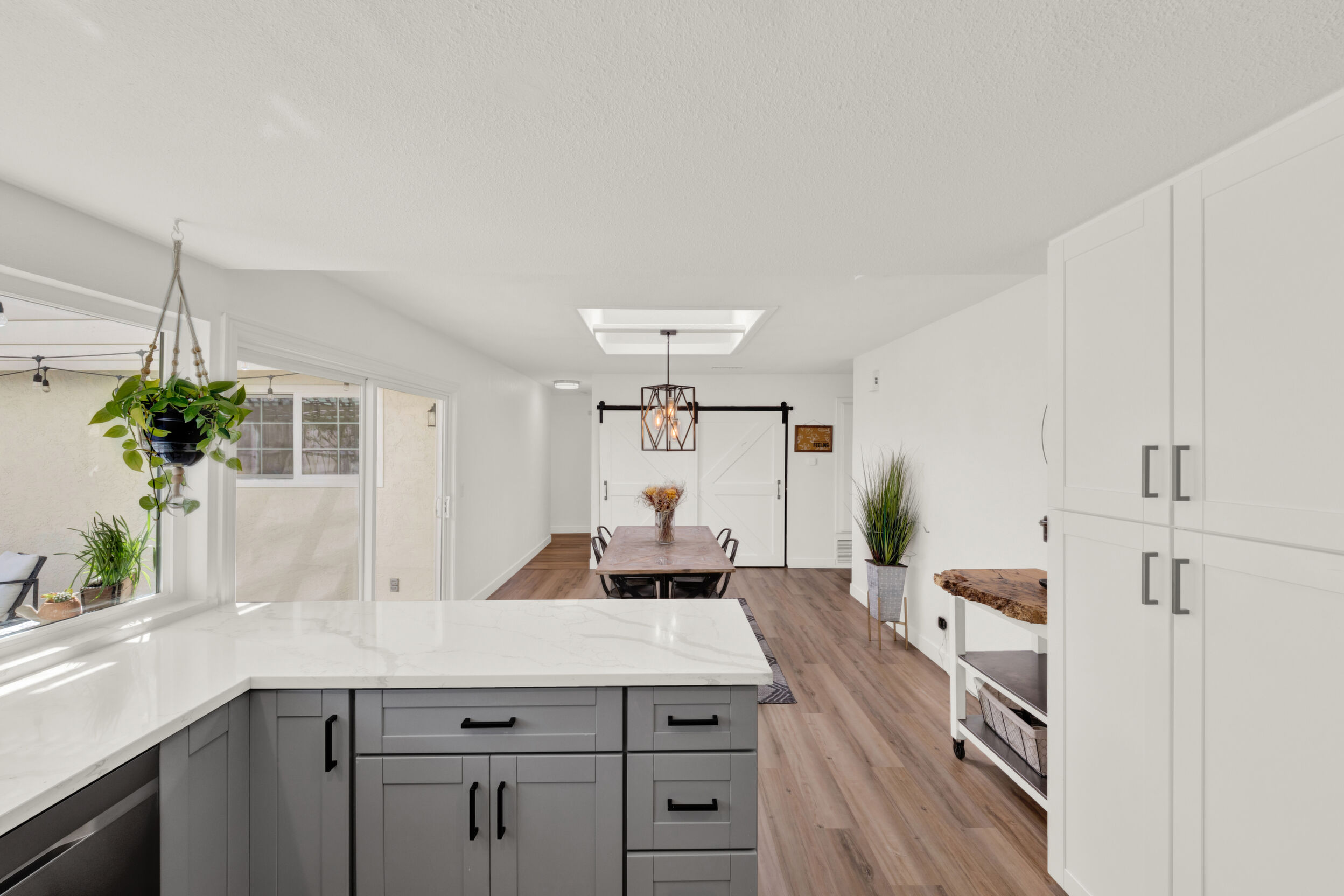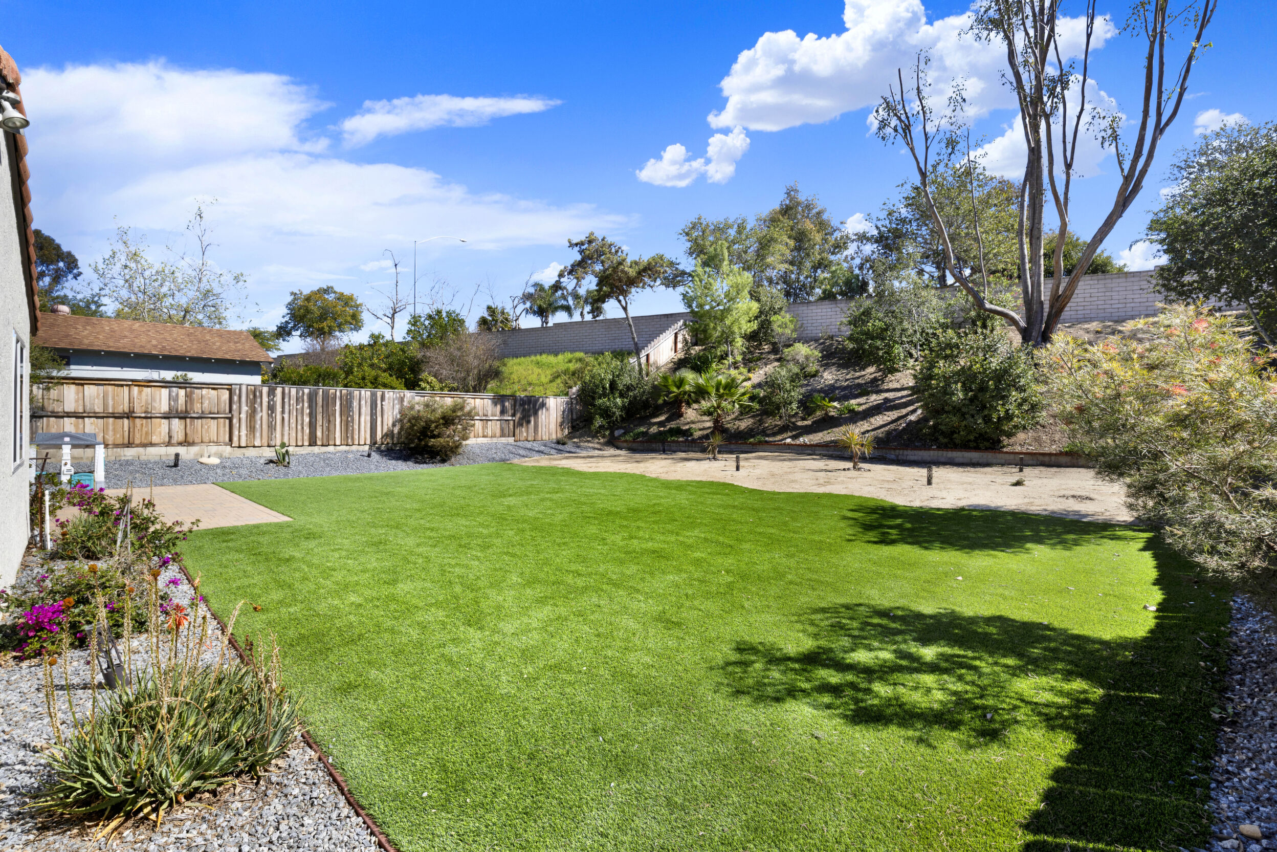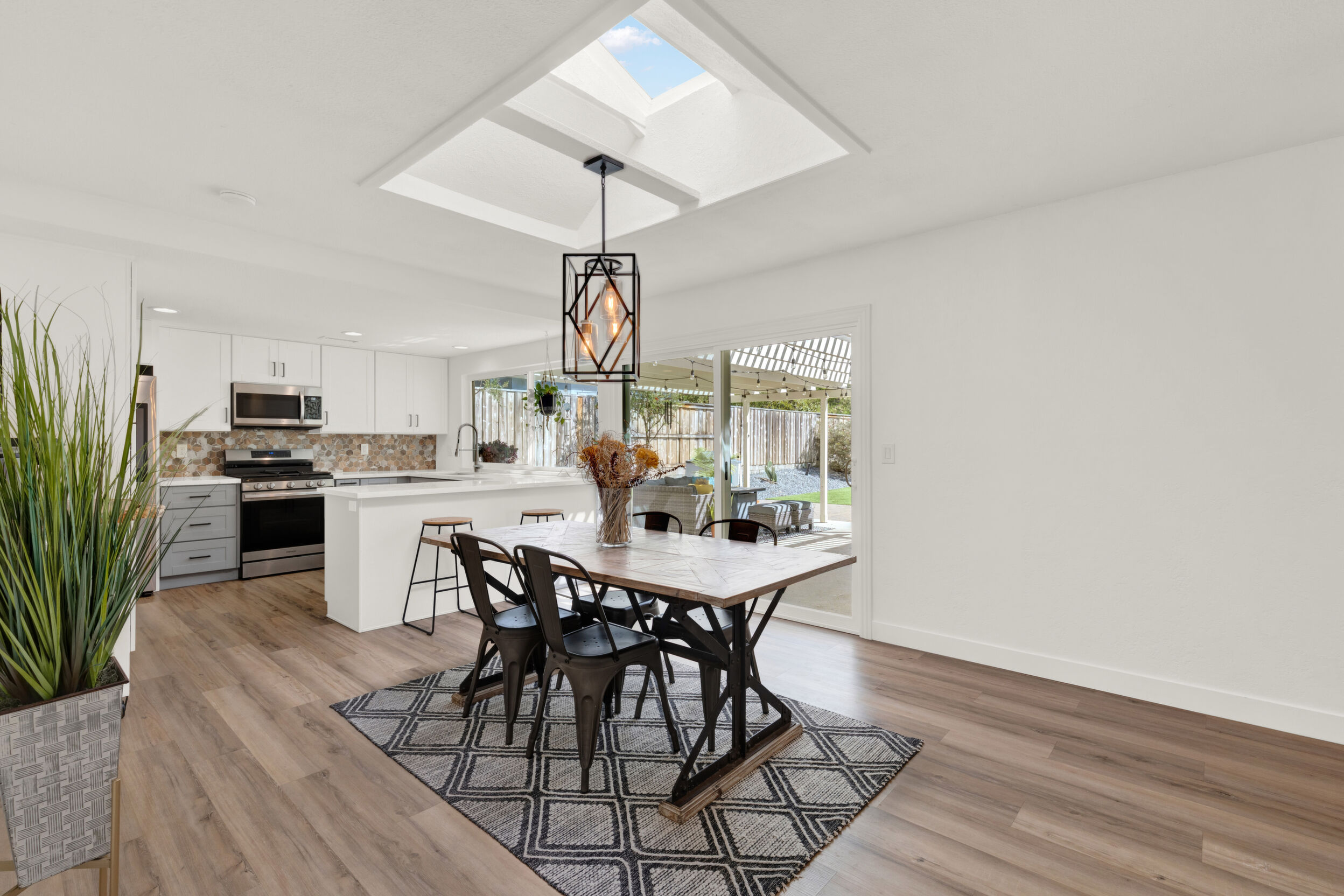 Beautifully remodeled single-story 4-bedroom, 2-bath home in the desirable community of Poway offering approximately 1,500 square feet of upgraded living space. This turnkey property reflects true pride of ownership with quality improvements and tasteful, modern finishes throughout. The interior features luxury vinyl plank flooring, a fully renovated kitchen with updated cabinetry, fixtures and appliances. The new kitchen flows seamlessly into an open-concept dining area, both of which open directly to the backyard-creating an ideal layout for indoor/outdoor living and entertaining. Newer dual-pane windows and skylights fill the home with abundant natural light. Enjoy remodeled bathrooms with clean, contemporary design. The exterior has been freshly painted, adding to its strong curb appeal. Both the front and backyard have been fully re-landscaped with attractive, drought-resistant landscaping for low-maintenance living. The oversized backyard is a true highlight, designed for both entertaining and everyday enjoyment. It features low-maintenance turf, decomposed granite, and a generous patio area perfect for outdoor dining, gatherings, or relaxing. Additional highlights include an oversized driveway and a 2-car garage with ample storage. Conveniently located near walking trails, a pond, and a neighborhood playground, and close to shopping, dining, and everyday amenities. Located within the highly regarded Poway Unified School District. A move-in-ready opportunity in a highly sought-after area.