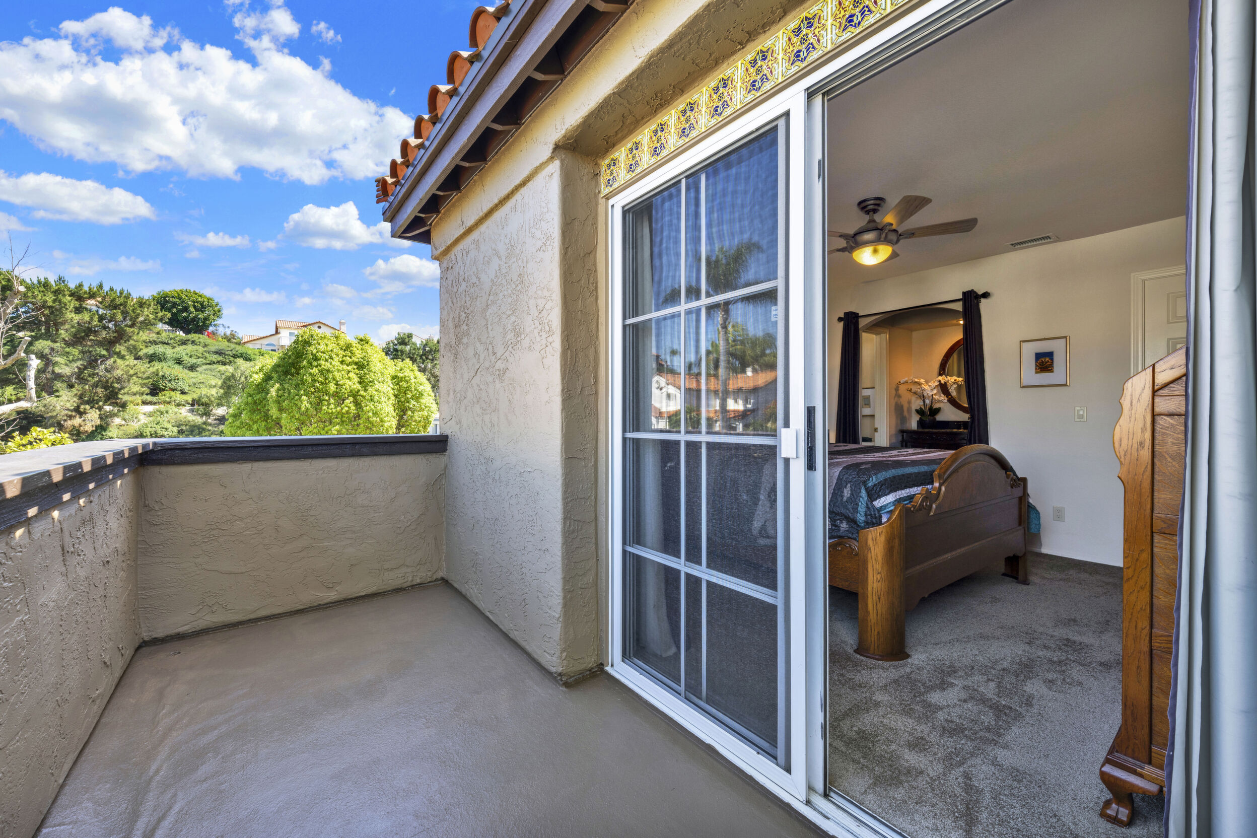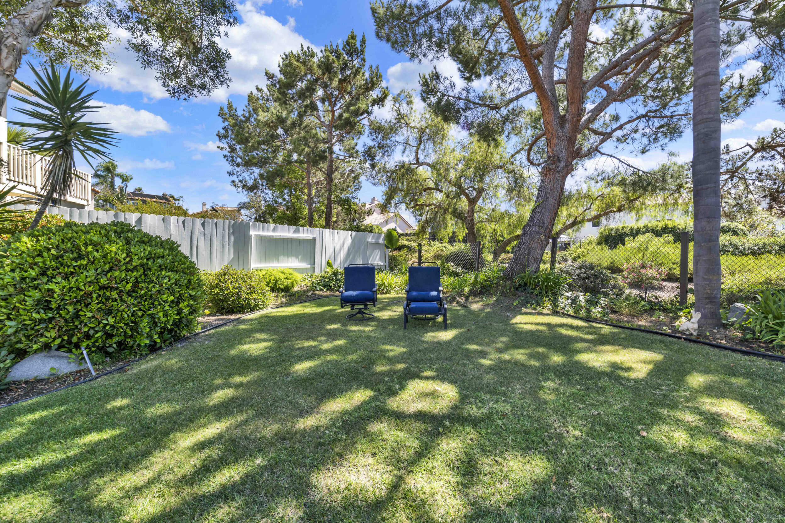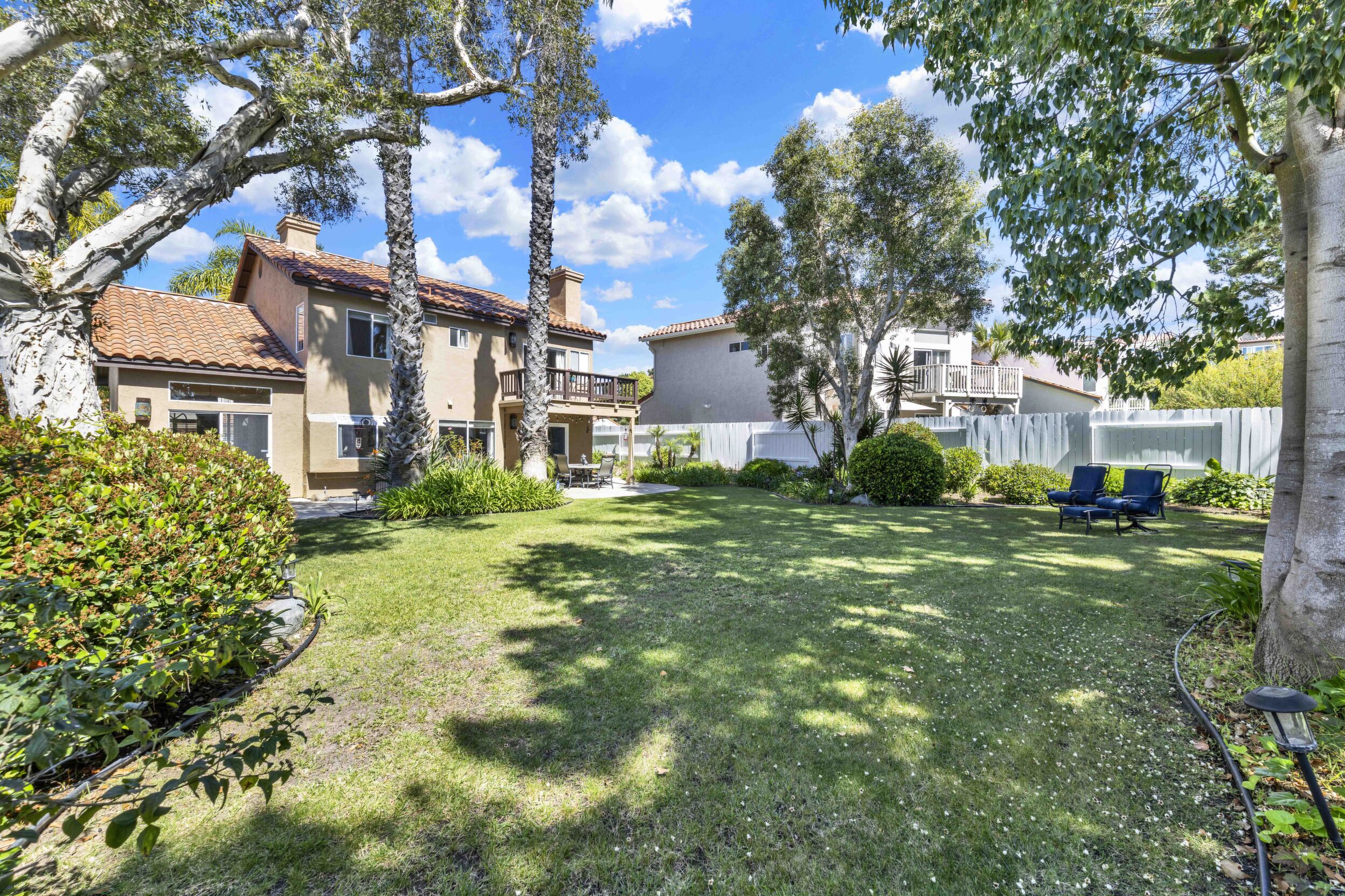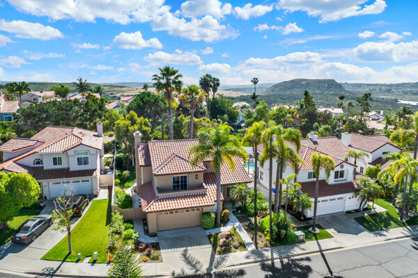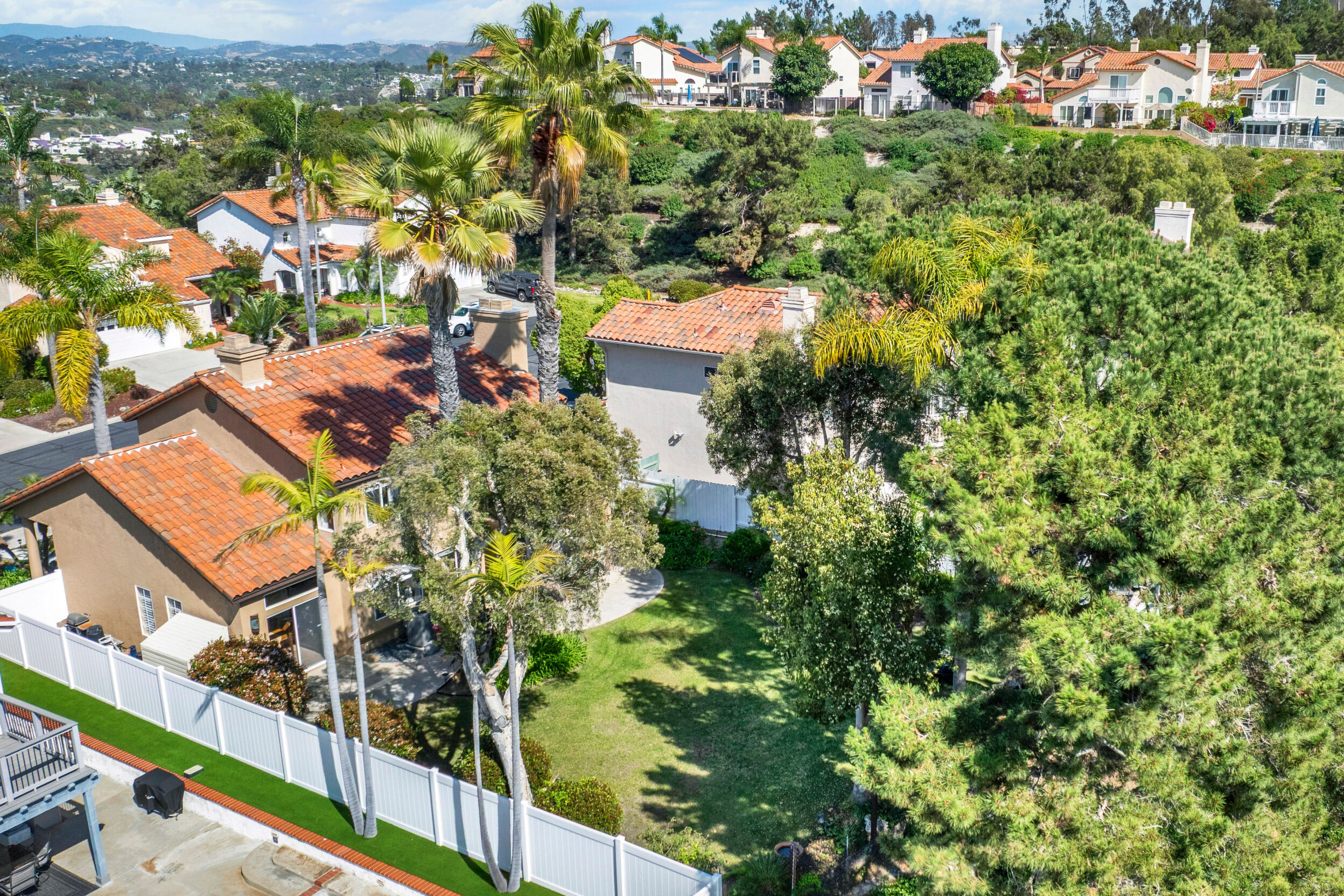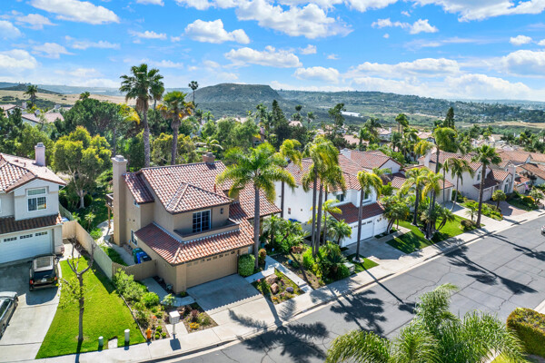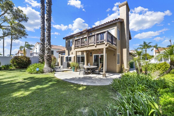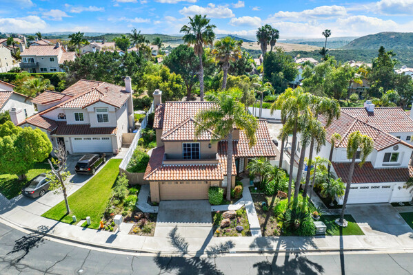 Located on a quiet cul-de-sac in the highly sought-after Ocean Terrace neighborhood, this exceptional and well maintained home is the perfect opportunity for a first-time buyer or those seeking flexible living arrangements! Thoughtfully designed, the layout is ideal for potential multi-generational living, featuring not one, but two spacious primary suites with private balconies on the second floor, along with a third bedroom and full bathroom on the main level! The home offers both formal living and dining rooms, as well as a separate family room and additional dining area, providing ample space for everyday living and entertaining. Three fireplaces...located in the main primary suite, living room, and family room add warmth and charm throughout the home. The beautifully refreshed kitchen showcases Silestone countertops, stainless steel appliances, and with it's picturesque backyard views, cooking will be a joy everyday! The main primary suite is a true sanctuary, complete with a large en-suite bathroom featuring dual vanities, a separate walk-in shower, a jetted tub, and a spacious walk-in closet. Enjoy your morning coffee or evening sunsets from it's private balcony with peek-a-boo ocean views, along with scenic vistas of the surrounding mountains and foothills. The second upstairs suite also includes it's own full bathroom and a generous private balcony. The giant park-like backyard backs to a serene greenbelt area and has plenty of room for a swimming pool, cabana or whatever your heart desires! Additional highlights include a complete roof re-papering completed in December 2024, offering added peace of mind for the new owner! Ideally located just minutes from beautiful sandy beaches, with Calavera Preserve and it's scenic hiking trails only a few blocks away, as well as convenient access to world-class dining, shopping, and golf. This stunning home is truly move-in ready...nothing to do but unpack and start making memories!