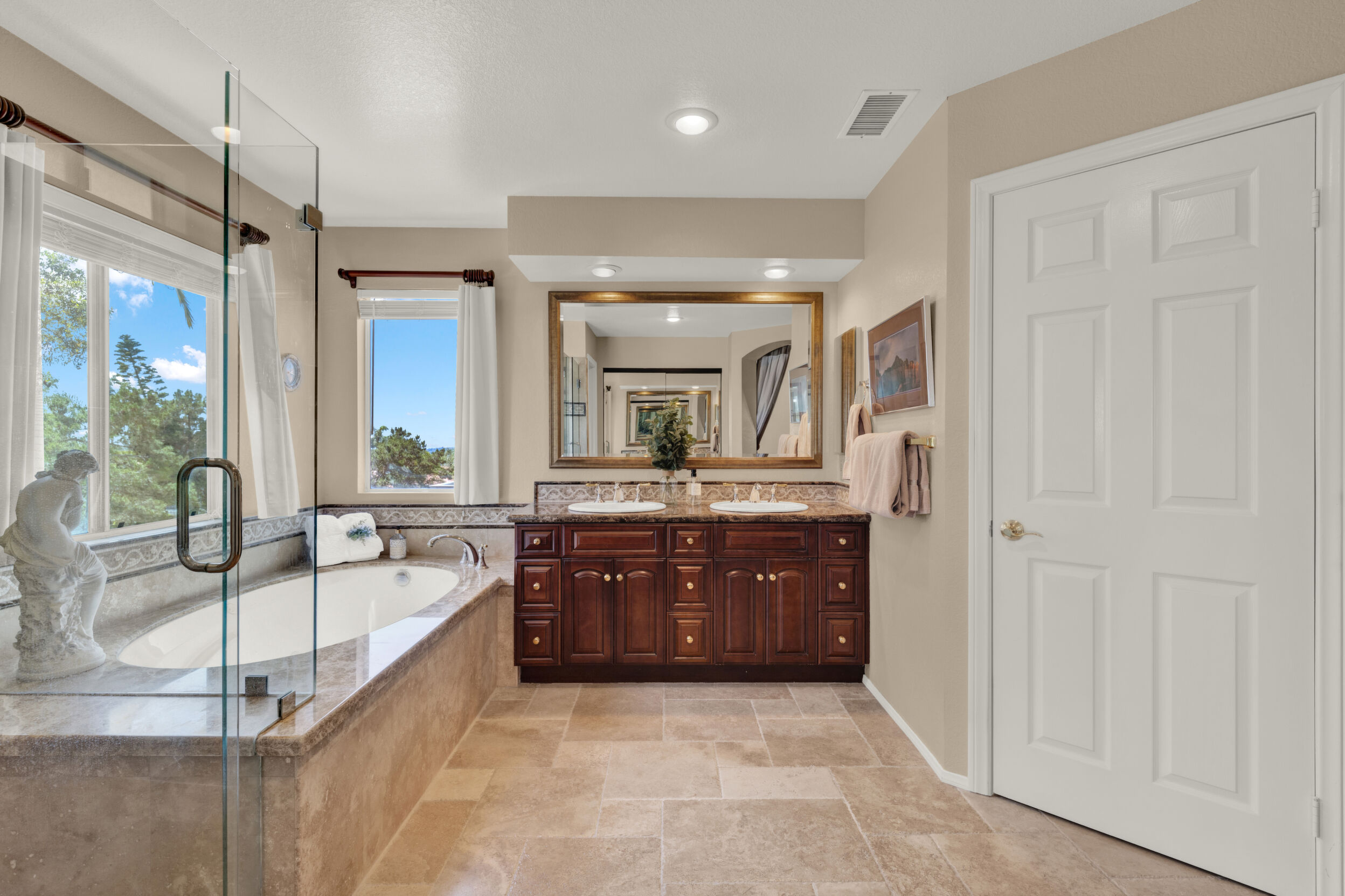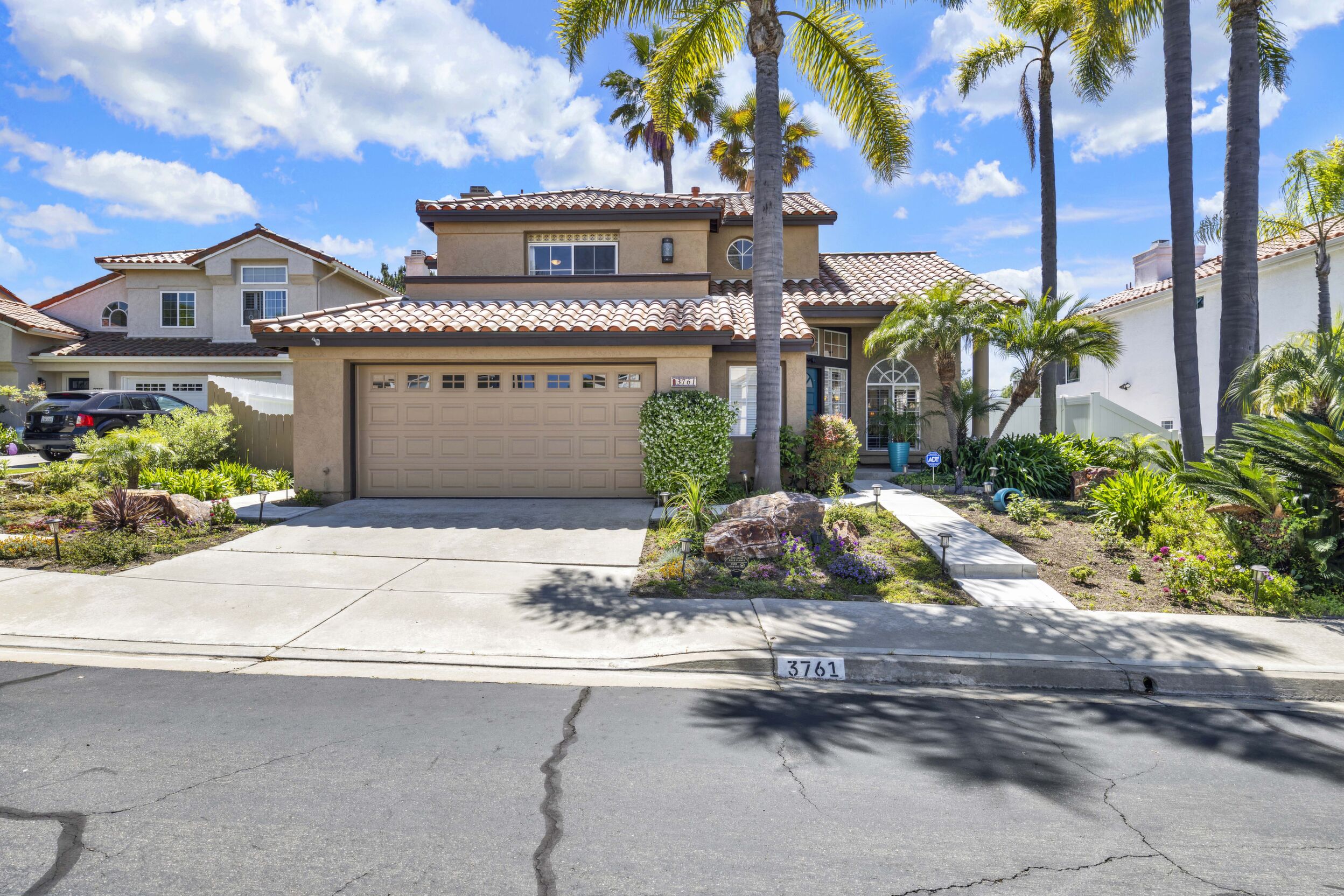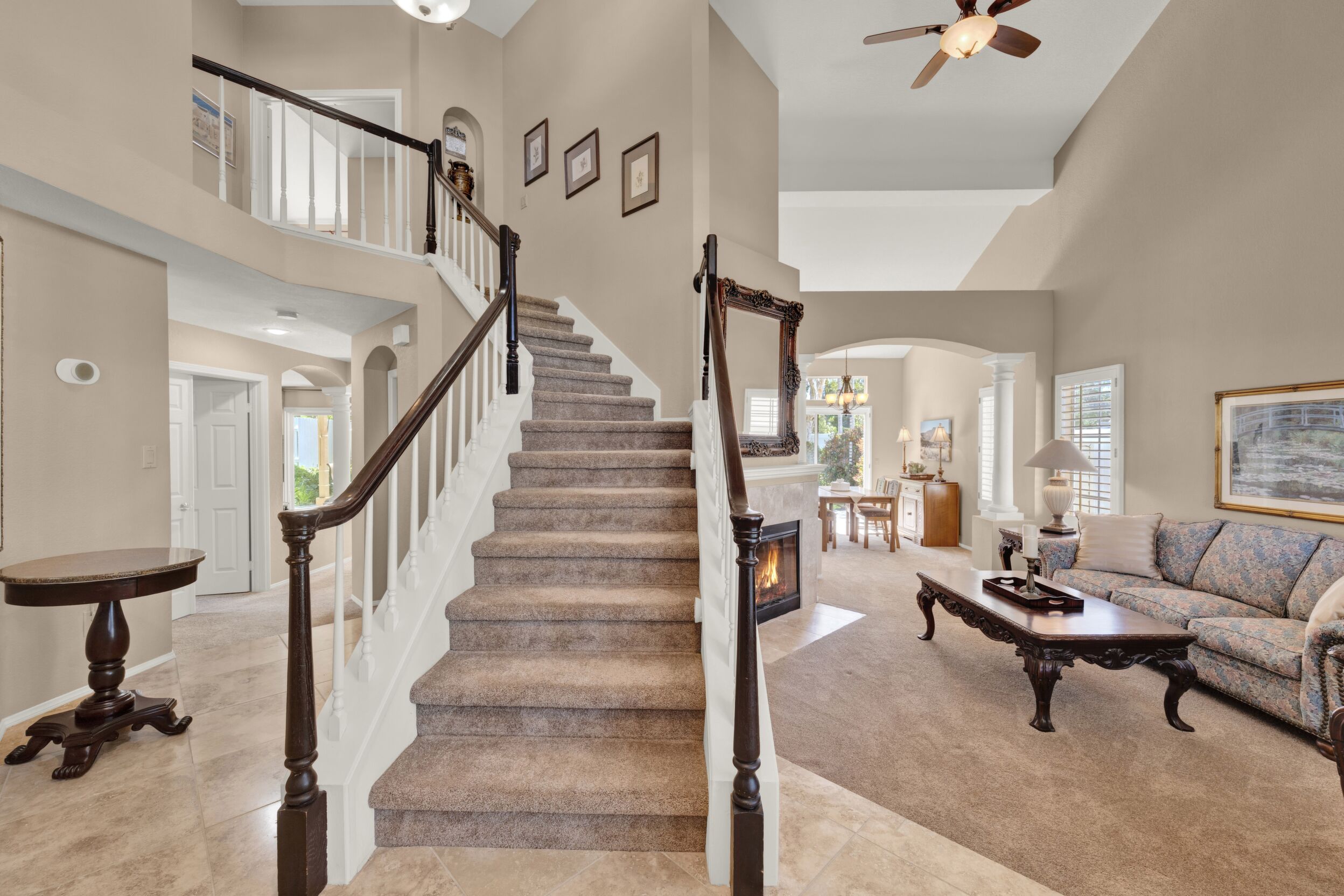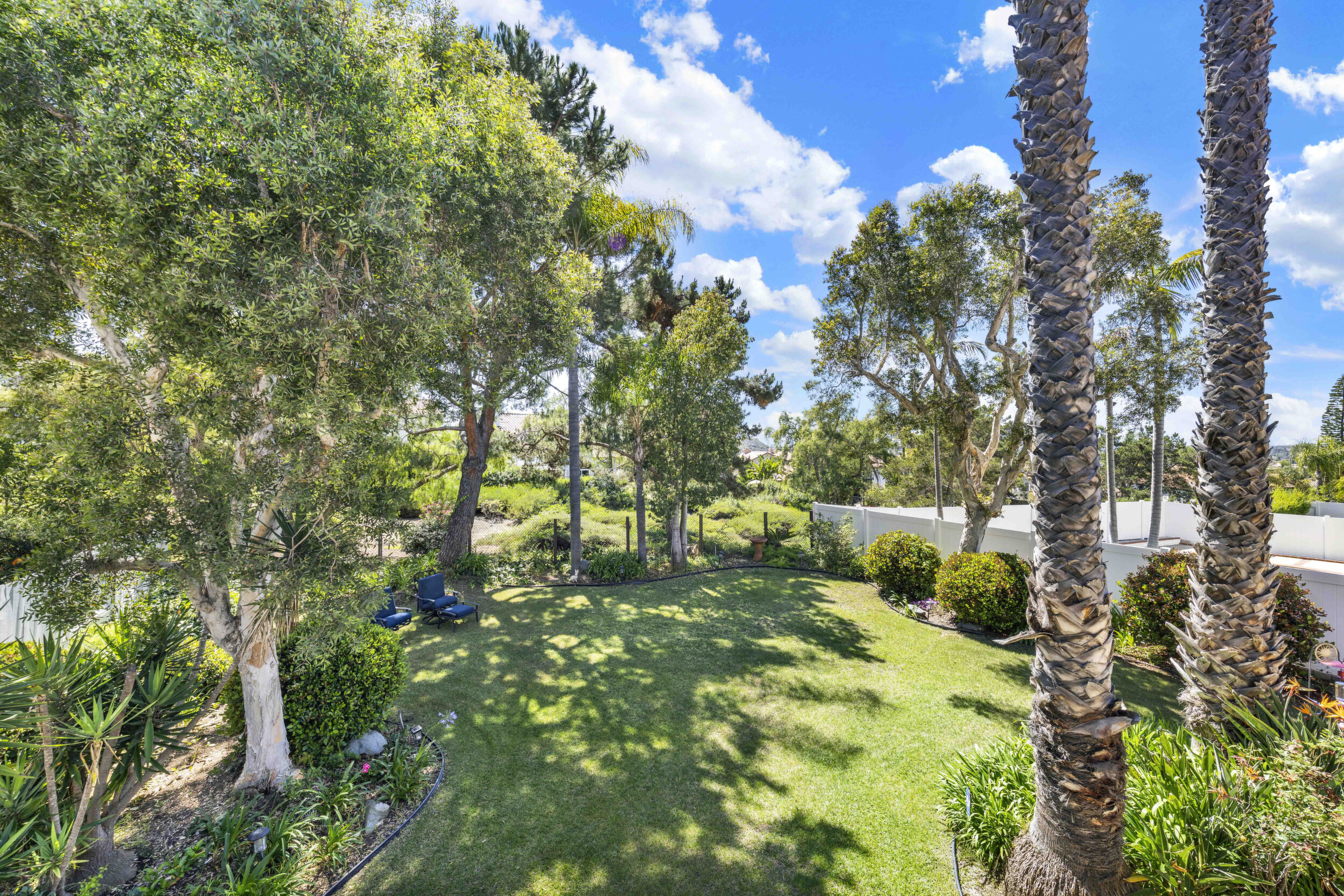 Located on a quiet cul-de-sac in the highly sought-after Ocean Terrace neighborhood, this exceptional and well maintained home is the perfect opportunity for a first-time buyer or those seeking flexible living arrangements! Thoughtfully designed, the layout is ideal for potential multi-generational living, featuring not one, but two spacious primary suites with private balconies on the second floor, along with a third bedroom and full bathroom on the main level! The home offers both formal living and dining rooms, as well as a separate family room and additional dining area, providing ample space for everyday living and entertaining. Three fireplaces...located in the main primary suite, living room, and family room add warmth and charm throughout the home. The beautifully refreshed kitchen showcases Silestone countertops, stainless steel appliances, and with it's picturesque backyard views, cooking will be a joy everyday! The main primary suite is a true sanctuary, complete with a large en-suite bathroom featuring dual vanities, a separate walk-in shower, a jetted tub, and a spacious walk-in closet. Enjoy your morning coffee or evening sunsets from it's private balcony with peek-a-boo ocean views, along with scenic vistas of the surrounding mountains and foothills. The second upstairs suite also includes it's own full bathroom and a generous private balcony. The giant park-like backyard backs to a serene greenbelt area and has plenty of room for a swimming pool, cabana or whatever your heart desires! Additional highlights include a complete roof re-papering completed in December 2024, offering added peace of mind for the new owner! Ideally located just minutes from beautiful sandy beaches, with Calavera Preserve and it's scenic hiking trails only a few blocks away, as well as convenient access to world-class dining, shopping, and golf. This stunning home is truly move-in ready...nothing to do but unpack and start making memories!