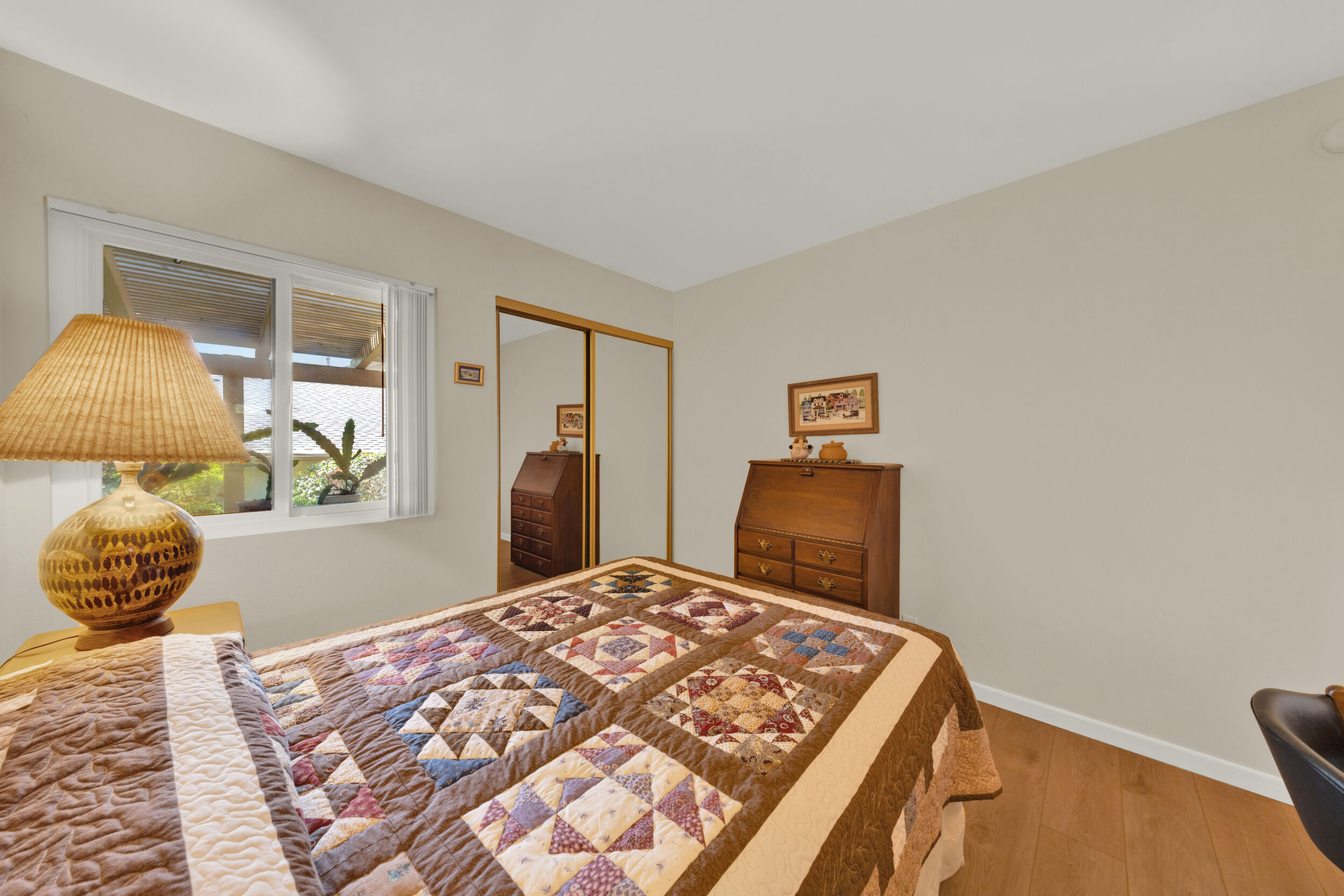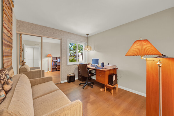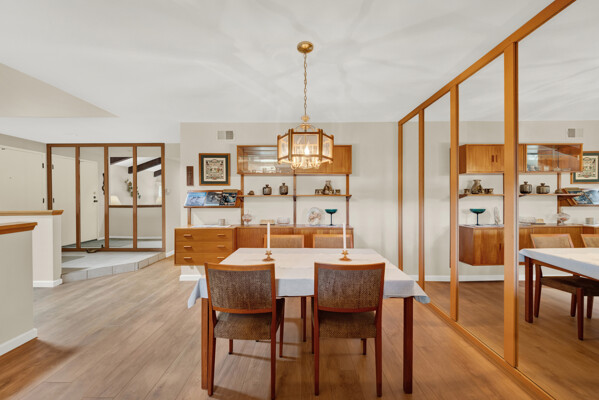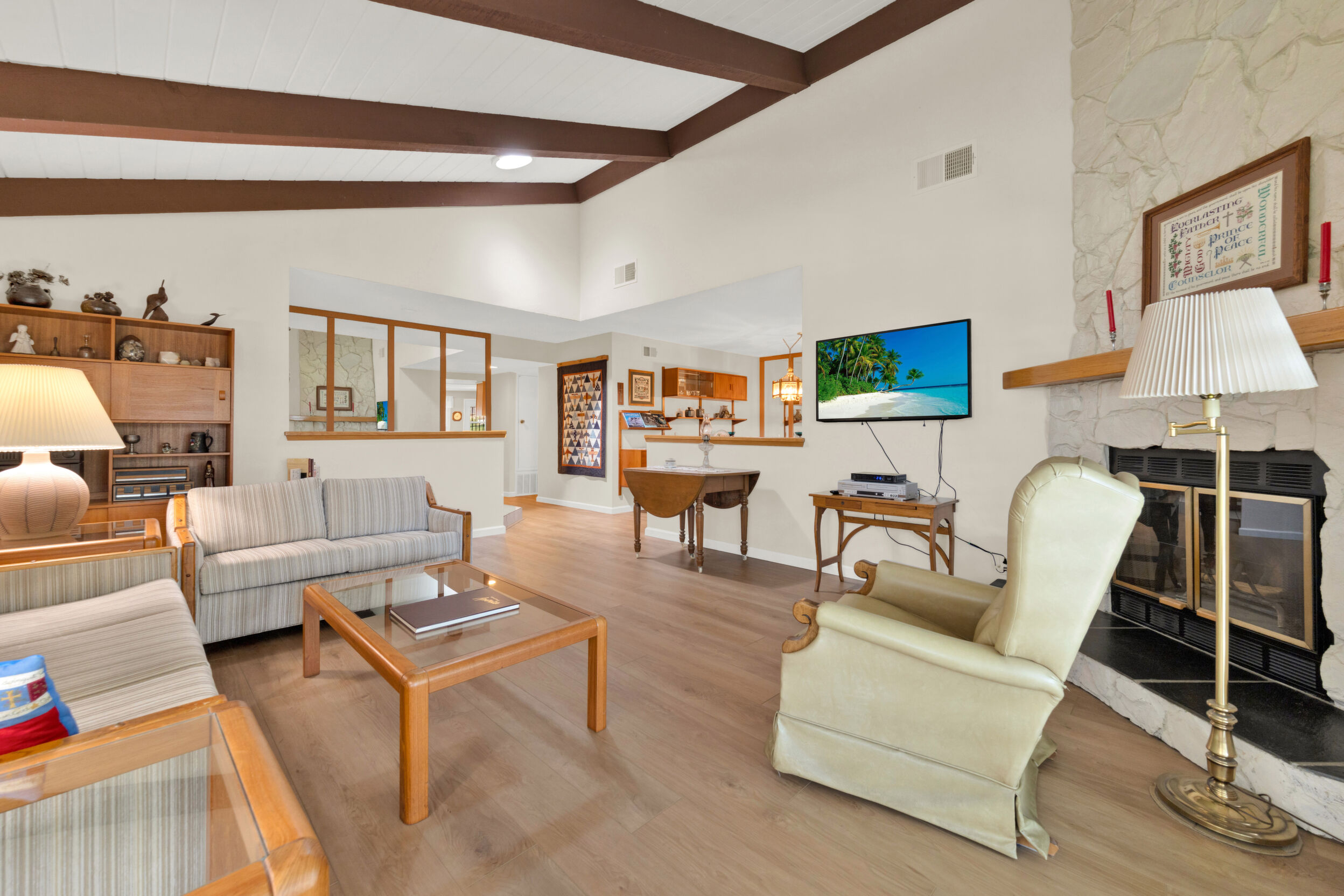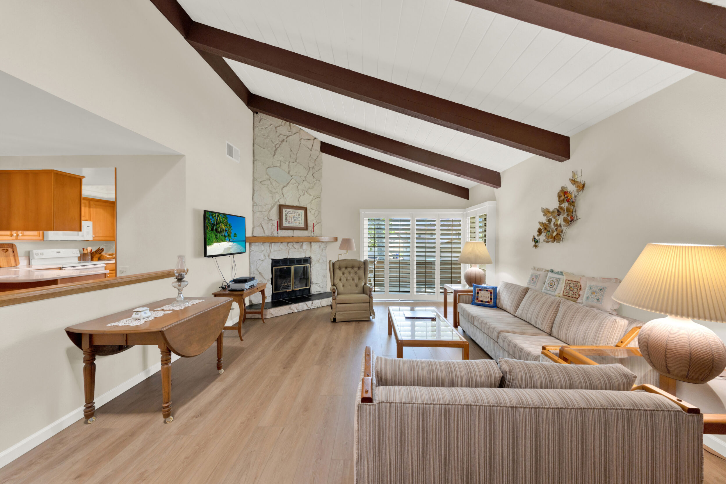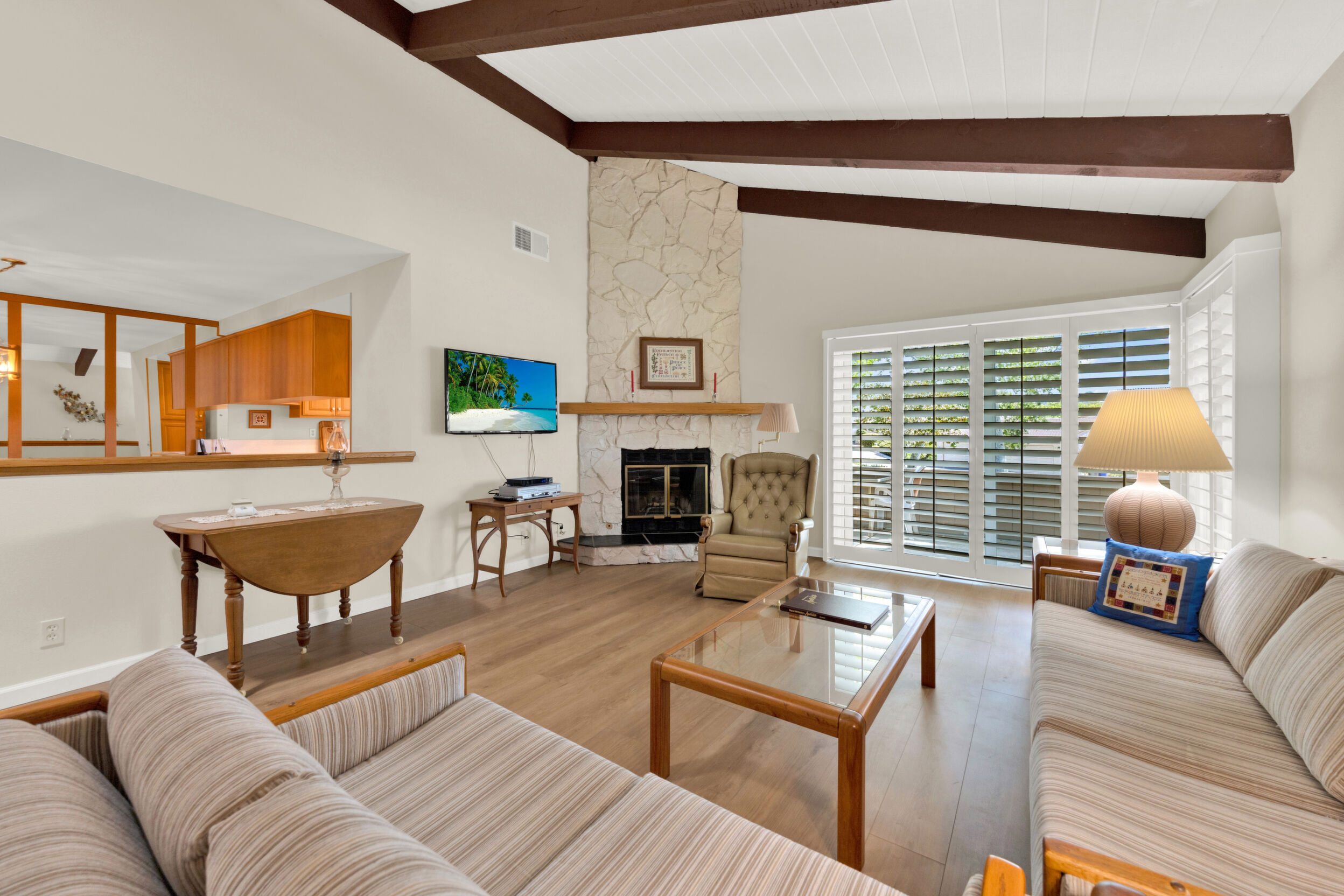 Beautiful turnkey 3-bedroom, 2-bath condo with a 2-car garage in the highly sought-after Smoketree community-where comfort, style, and convenience come together effortlessly. From the moment you step inside, you're welcomed by a bright, inviting atmosphere enhanced by recessed lighting, warm laminate flooring, and dual-pane windows that fill the home with natural light while providing energy efficiency and quiet comfort. Elegant wood shutters and security screens add both charm and peace of mind. The thoughtfully updated kitchen serves as the heart of the space, featuring refaced cabinetry, sleek seamless Corian-style countertops, and included appliances-perfect for both everyday living and entertaining. Every detail has been designed to offer a balance of modern beauty and practical functionality, complemented by thoughtful built-ins that enhance both storage and style. Spacious living areas provide room to relax and gather, while the well-appointed bedrooms offer a peaceful retreat at the end of the day. This home is truly move-in ready, making it an ideal choice whether you're settling in or investing in a property with lasting appeal. Enjoy the added value of a solar system with Tesla battery backup, delivering energy efficiency and reliability when it matters most. Beyond your front door, the Smoketree community offers a lifestyle to love, with access to a sparkling pool and welcoming clubhouse. The HOA covers water and common area maintenance, allowing you to spend more time enjoying and less time worrying. Perfectly located near shopping, dining, and everyday conveniences, this home isn't just a place to live-it's a place to feel at home.